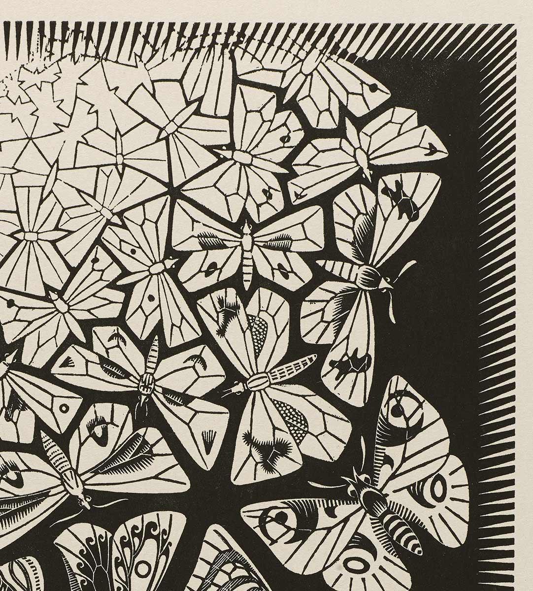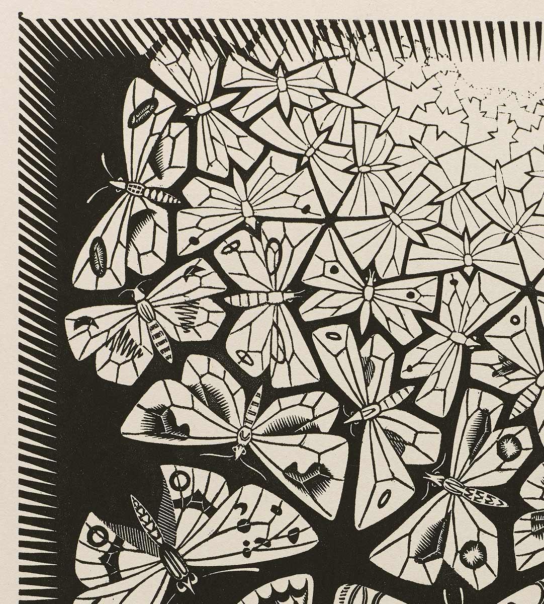 Nevertheless, he had already effected a combination of transformation and convergence in the aforementioned pieces. In Butterflies, Escher endeavoured to infuse the print with character by having the butterflies all differ from each other. He had done this before in the woodcut Sun and Moon (1948), a tessellation of birds that are all different.
