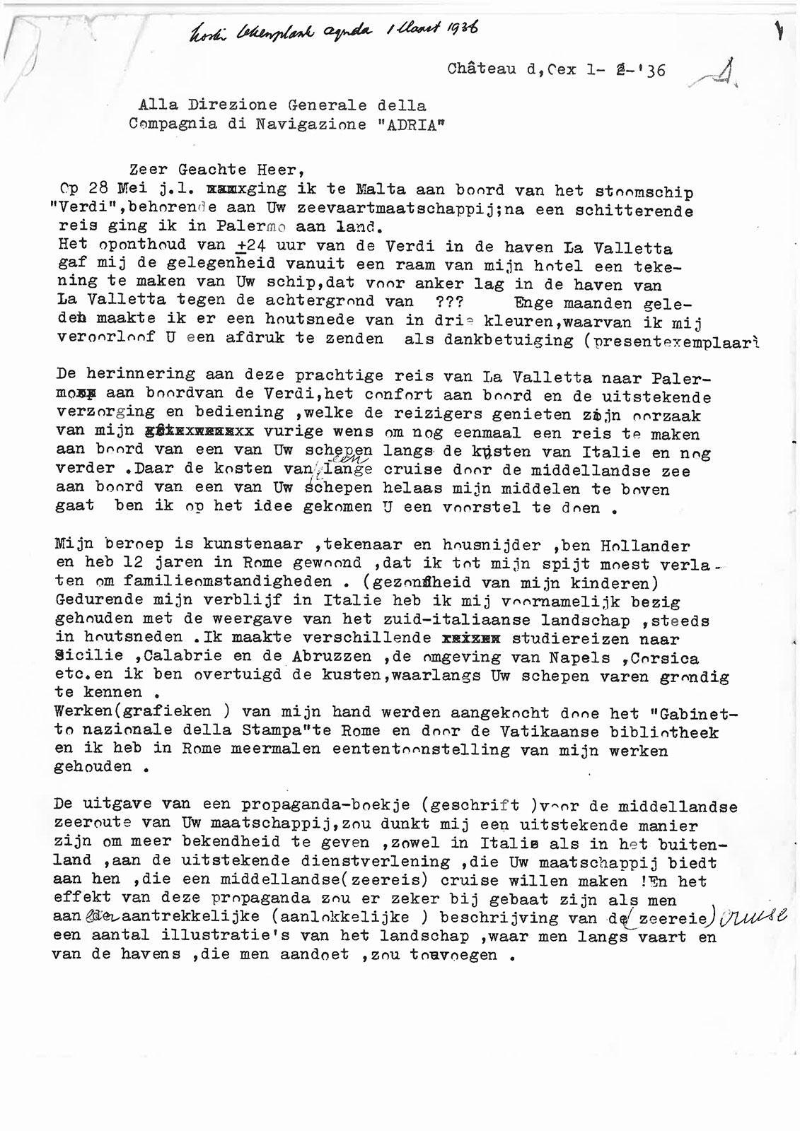 Nevertheless, the couple are astonished to learn that their proposal is accepted. Escher was already familiar with the passenger-carrying cargo ships, having travelled on the Verdi during his 1935 spring tour of Sicily and Malta. 'Verdi' is the boat depicted in the print Senglea. To convince the shipping company of his good intentions, he encloses a copy of this print with his letter.