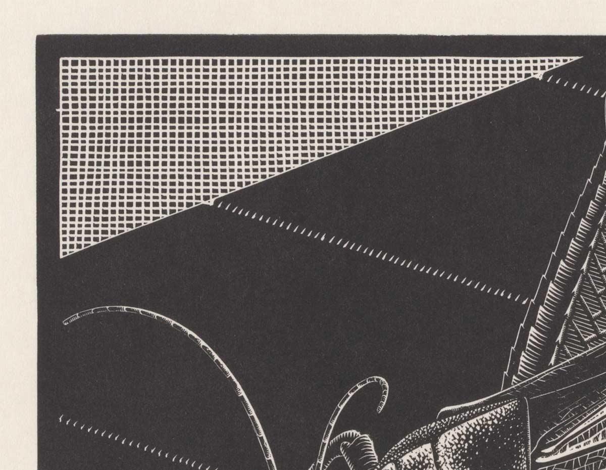 This week we had a slight change in terms of the works being exhibited. Some were returned to the archive and were replaced by a series of other works by Escher. One of these is Grasshopper, a wood engraving from March 1935. In very fine detail Escher shows a specimen of this winged insect with its powerful hind legs, compound eyes, antennae and folded wings.