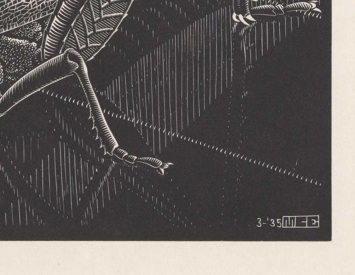 Just as he did in his mezzotint Mummified frog, his wood engravings Scarabs and Libellula (Dragonfly) and the lithograph Ant, this is an example of how Escher holds a magnifying glass over a tiny creature. As if he is putting it on a pedestal. In this case literally: the insect stands on a mirroring surface in which the small details of its head, body and legs are reflected. The grasshopper radiates an unyielding presence, defying his tiny stature.
