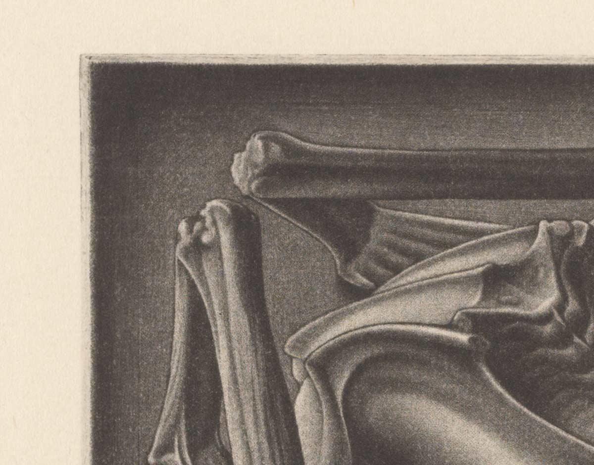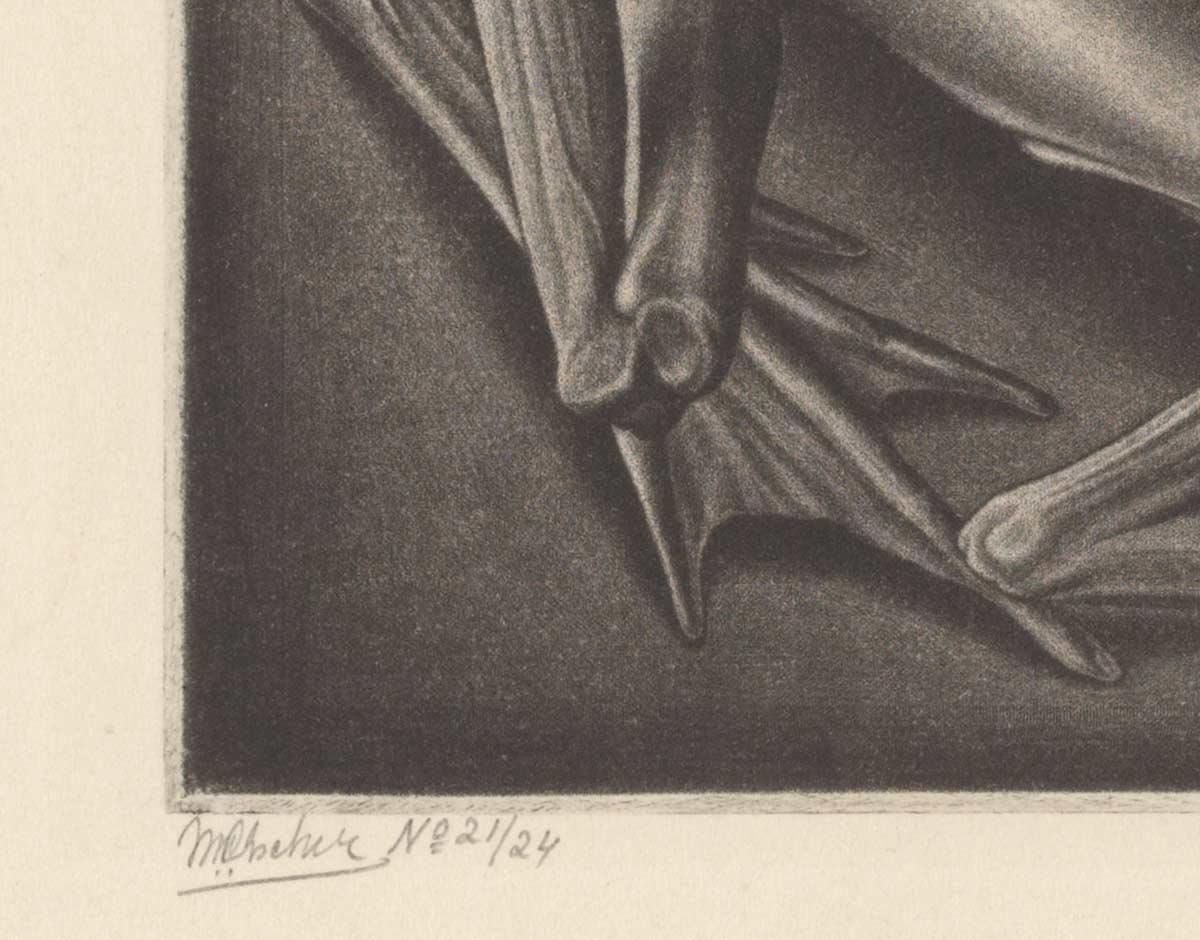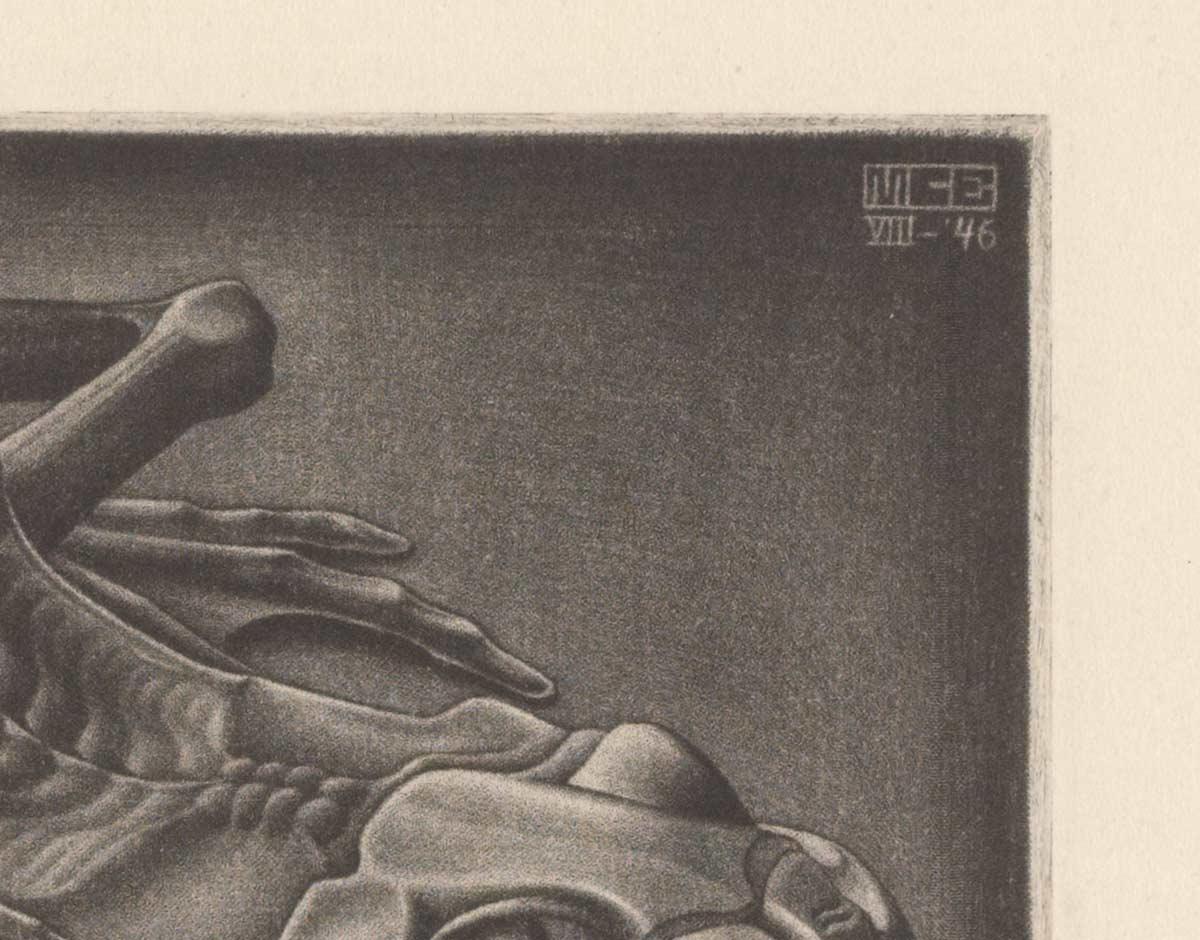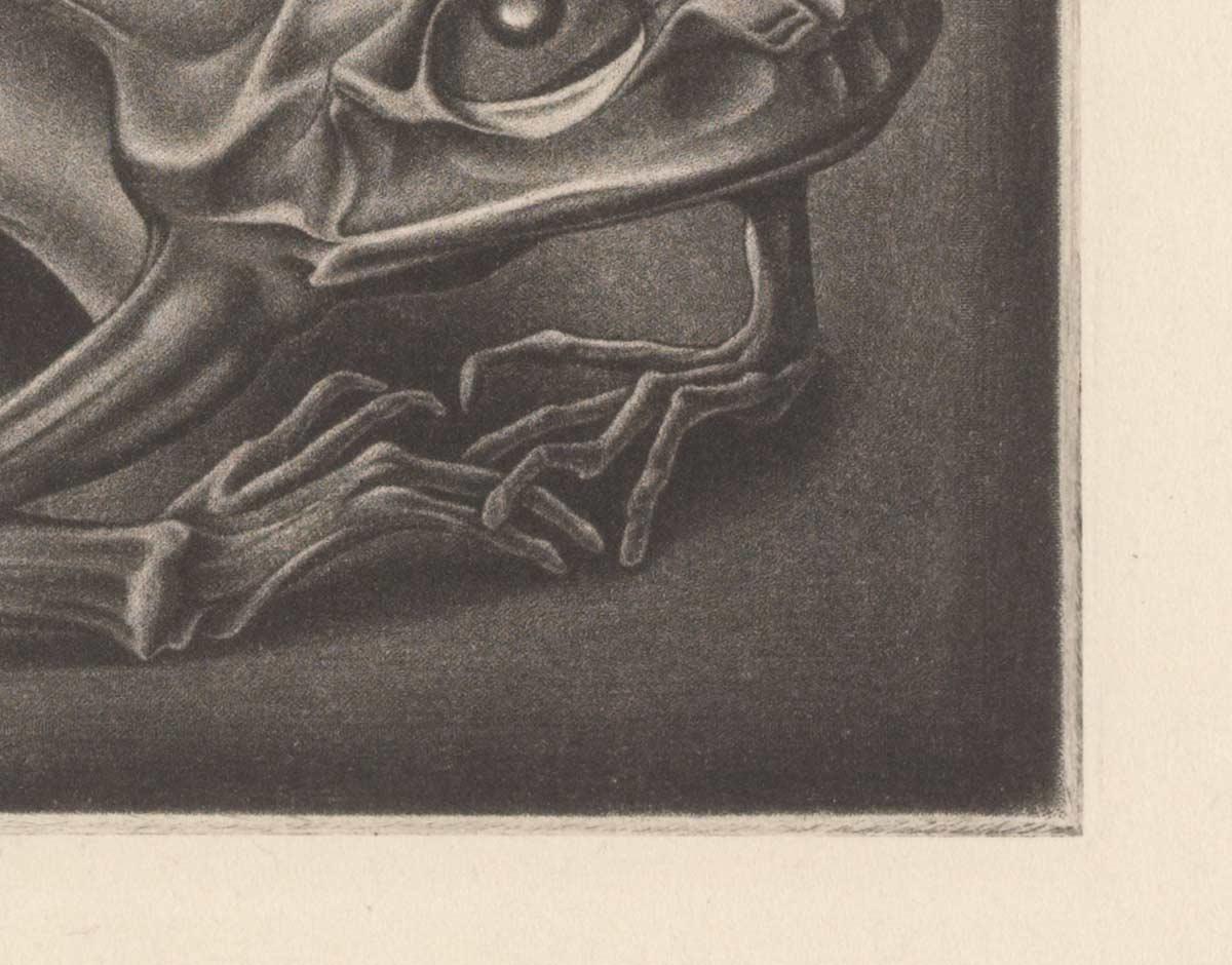 In August 1946 Escher created a mezzotint of a mummified frog. He rarely used this technique, despite the subtle nuances in tone it can achieve. The choice of both subject and composition are atypical for this period, in which he experiments with tessellations and geometrical shapes. He depicts the skeleton exactly as he sees it. Escher found the frog behind a piece of furniture in his own house. He printed the work himself on his own press, in an edition of 24 copies*.