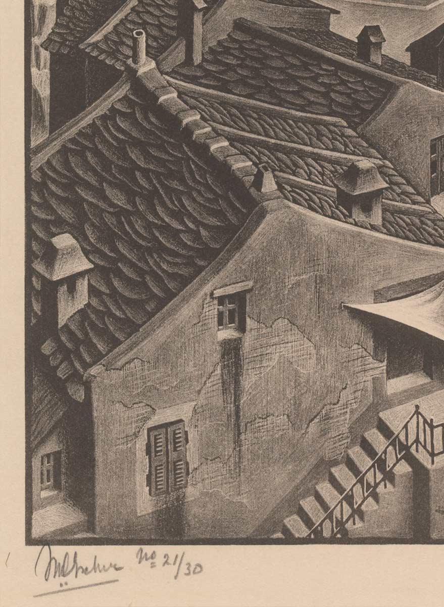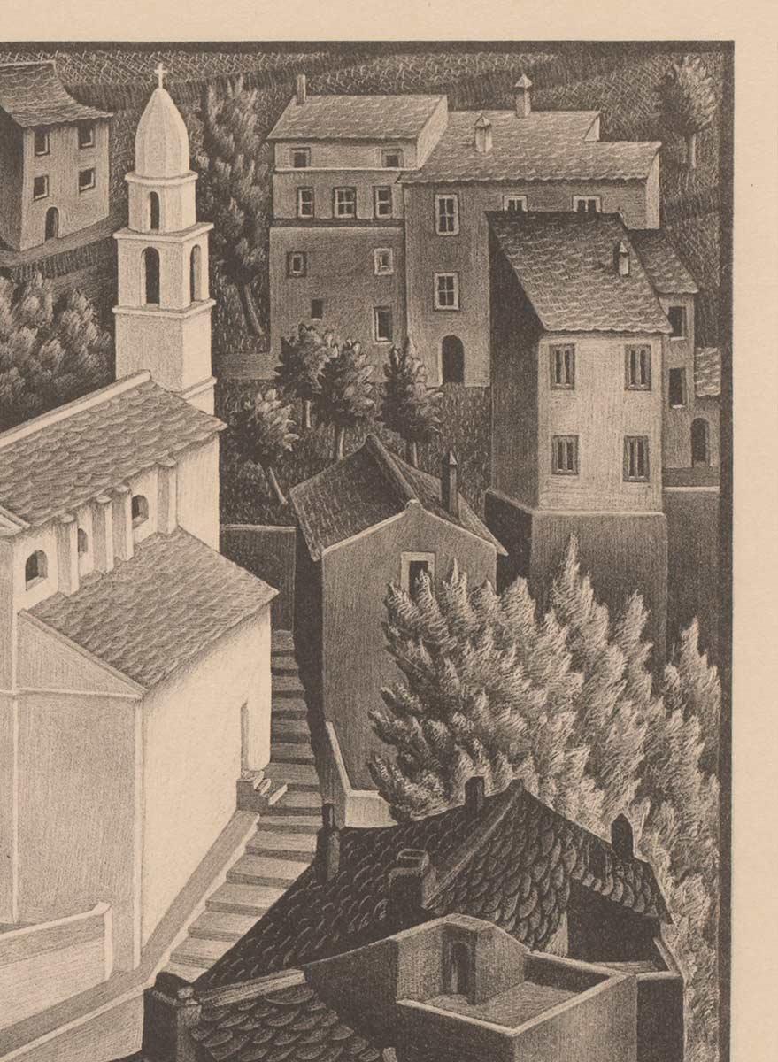 In May 1933, Escher made a trip across Corsica with his friends Giuseppe Haas-Triverio and Roberto Schiess. Corsica was quite rugged and desolate in those days, inhabited by just 150,000 people. Within five weeks, they crossed the island on foot, by carriage, and by bus*. The medieval town of Nonza was the subject of a lithograph Escher made the following winter.