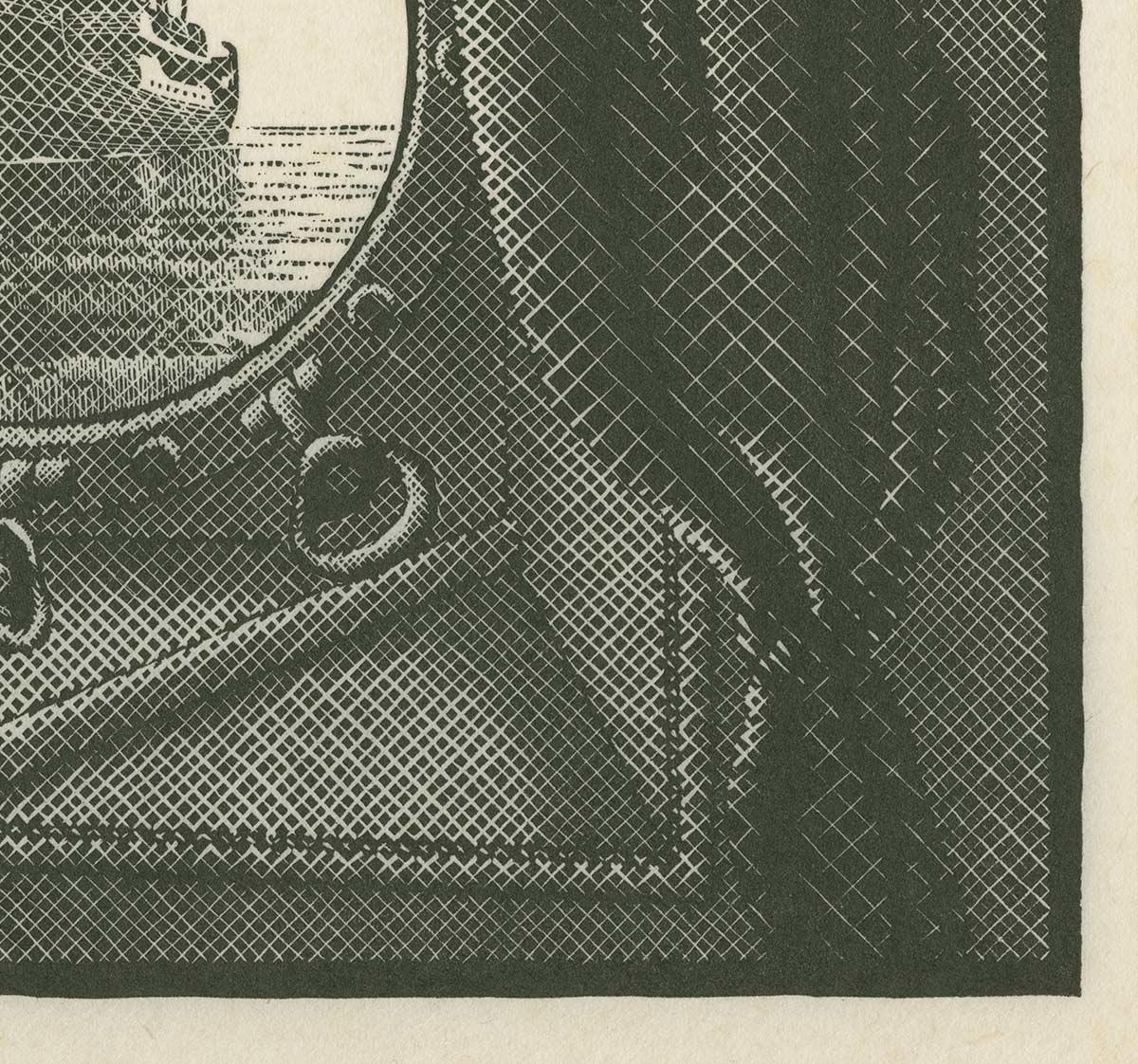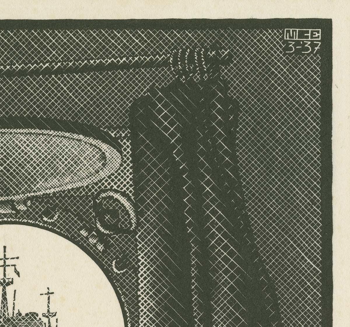 Escher will not finish the drawing before 21 June. By that time he is sailing on the Paganini, a ship that returns him and his wife from Spain to Italy. Escher likes the porthole of this ship better and he incorporates it into the drawing. The boat, too, undergoes a change: Escher turns it round and puts an extra sail on it. The following winter, when he creates a woodcut of the same subject, Escher again changes the sailing boat: it now became a freighter.