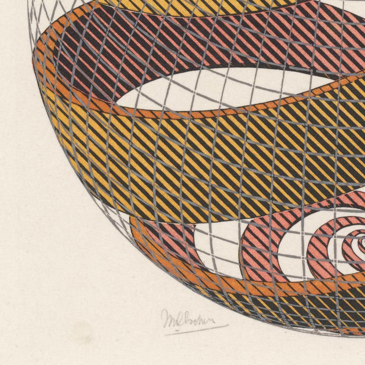 Sphere Spirals is part of a series of prints that demonstrate Escher's fascination for difficult constructions. He saw it as an enormous challenge to visualise complex, three-dimensional objects in such a way that the eye of the viewer understands how they are put together. He often 'opened them up' so that there are glimpses of the inside or the back, parts that would normally be invisible to the eye. Other prints with this property are Two Intersecting Planes, Concentric Rinds, Spirals, Three Intersecting Planes, Rind, Bond of Union, Sphere Surface with Fish, Four Regular Solids and Knots. They are extremely detailed representations of complex and remarkable shapes. But they are also prints that are regarded by many as atypical work for Escher. They are not illusions; the shapes are not impossible. They also appeal to the intellect more than to the heart. Yet these are prints in which Escher's genius clearly manifests itself. He visualised constructs that might exist, but which without his efforts would probably never have come to life. He's showing us something we've never seen before.