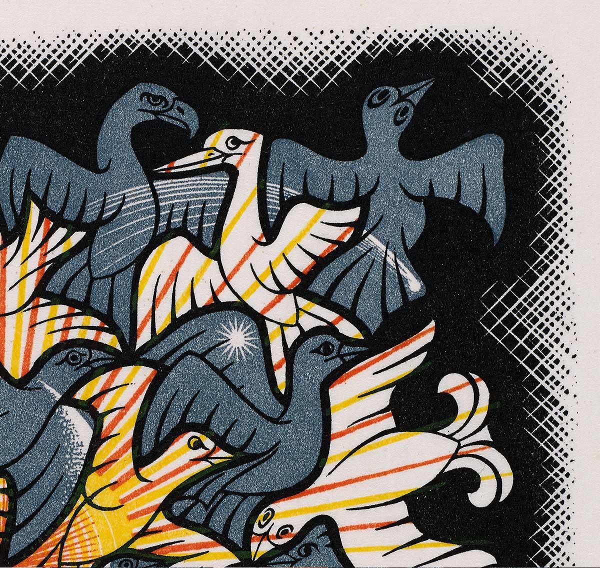 Birds are a regularly recurring subject in Escher’s work, mostly in one of his many tessellations. Sun and Moon, a woodcut from April 1948, is one of them. But there is something special about this one.