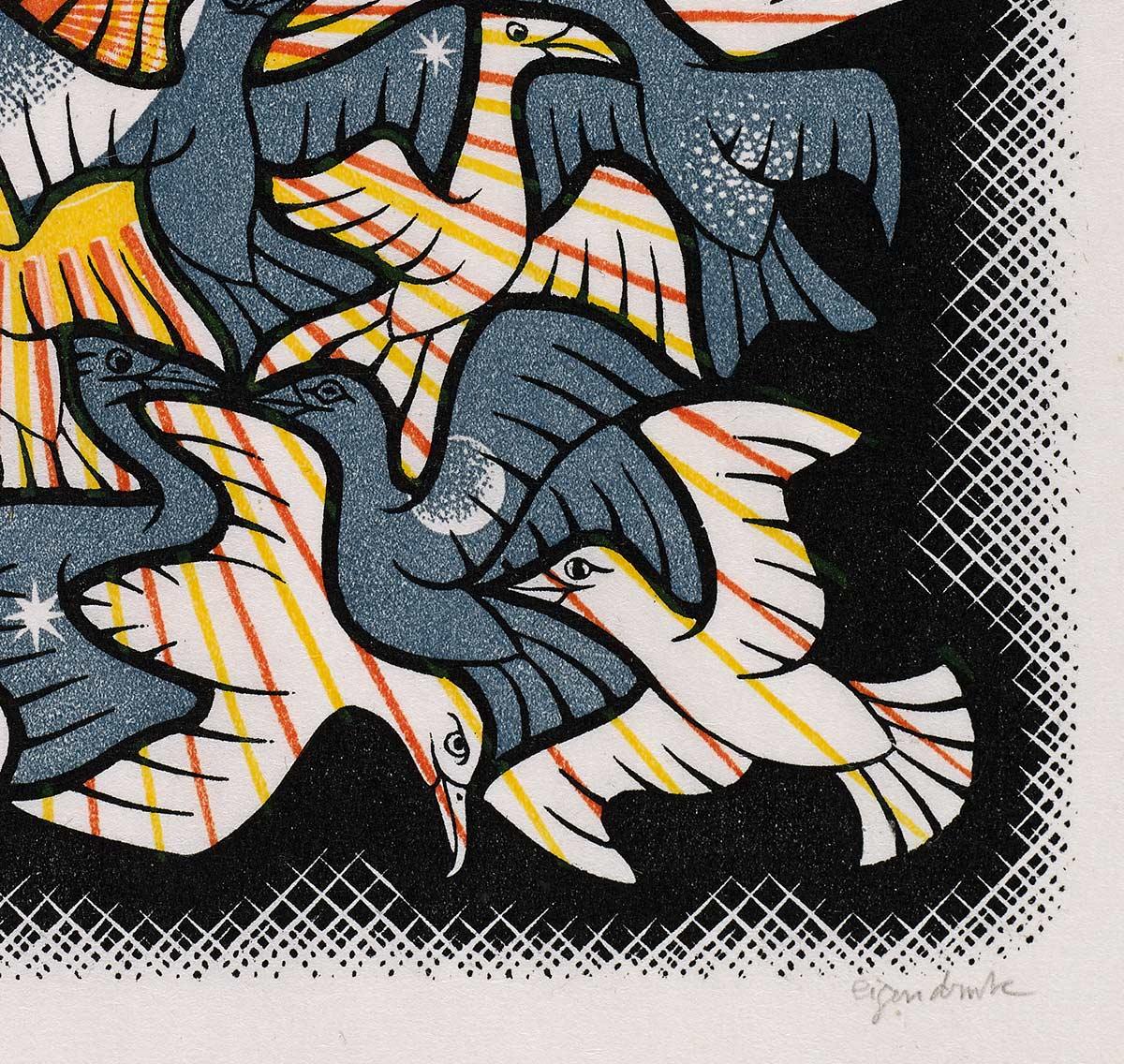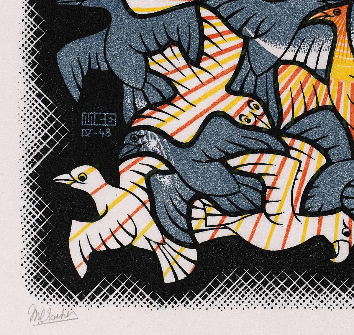 To achieve an optimal result in a tessellation, the birds, fish, reptiles and other shapes are usually identical. But the 14 white and the 14 blue birds in this print are all different. As was the case in the famous woodcut Day and Night (1938), two worlds are integrated in Sun and Moon. But where they exist alongside each other in Day and Night (day on the left, night on the right), the two worlds in Sun and Moon are superimposed. The white birds are in the division of the red and yellow sun, making the blue ones stand out. The blue birds are embedded in the night sky, with a crescent moon in the centre and with stars, planets and a comet. In turn, the white birds are highlighted.