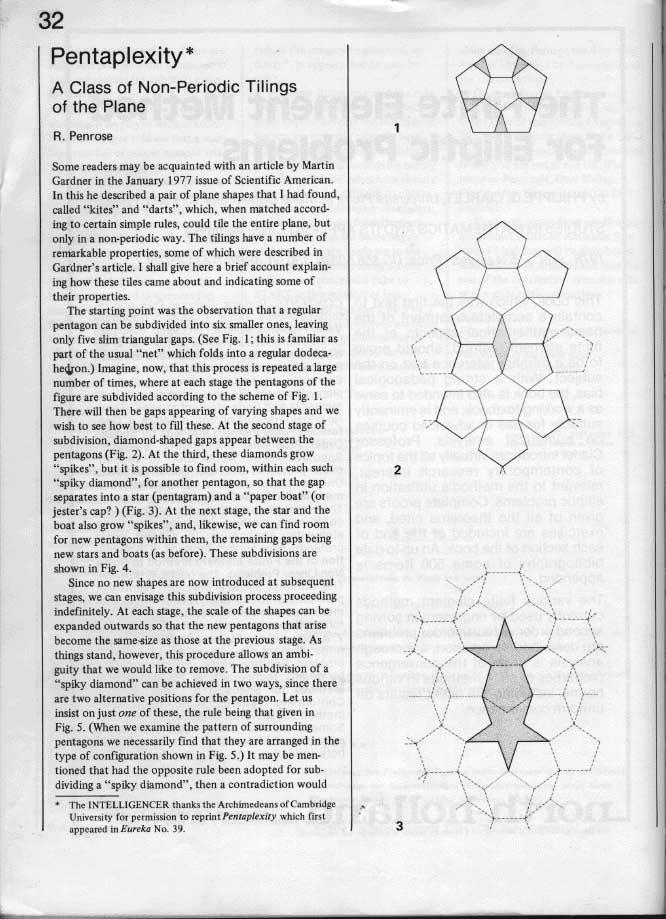 In het artikel met de titel 'Pentaplexity', gepubliceerd in 1979 in het wiskundig tijdschrift Eureka, beschreef Penrose zijn zoektocht naar a-periodieke betegelingen.