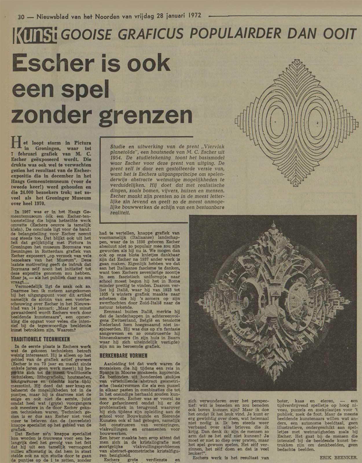 Aanvankelijk denk je dat dit een prijzend stuk wordt. De koppen zijn heel positief en de auteur begint met de constatering dat de kunstenaar bij het publiek steeds populairder wordt. De aanleiding voor het artikel is een tentoonstelling van Escher in Pictura in Groningen maar op hetzelfde moment is er ook een tentoonstelling in Boijmans van Beuningen in Rotterdam. 'Op verzoek van vele bezoekers van het Museum.' De auteur vermoedt dat Boijmans het anders nooit gedaan zou hebben. Vervolgens begint hij de kunstenaar stelselmatig af te breken, gebruikmakend van woorden als 'weinig interessant', 'traditioneel', 'oubollig', 'geforceerd', 'gegoochel', 'spelletje' en 'het resultaat van boter, kaas en eieren.'