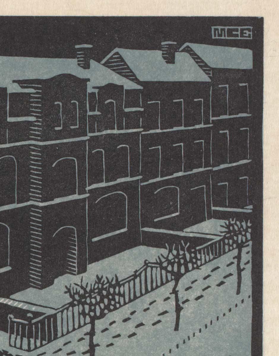 December 1938 is een ijskoude maand in Brussel. Een perfecte achtergrond voor een kleine houtsnede (18 x 14 cm) die Escher kort daarvoor maakte voor de Nederlandse criticus en dichter Jan Greshoff, die net als hijzelf in Brussel woonde. Hij werkte daar als cultureel correspondent van de Nieuwe Rotterdamsche Courant en Het Vaderland. Ter gelegenheid van zijn vijftigste verjaardag op 15 december 1938 boden de vrienden van Greshoff hem deze houtsnede aan, met daarop een winters Brussel en zijn eigen huis als middelpunt.