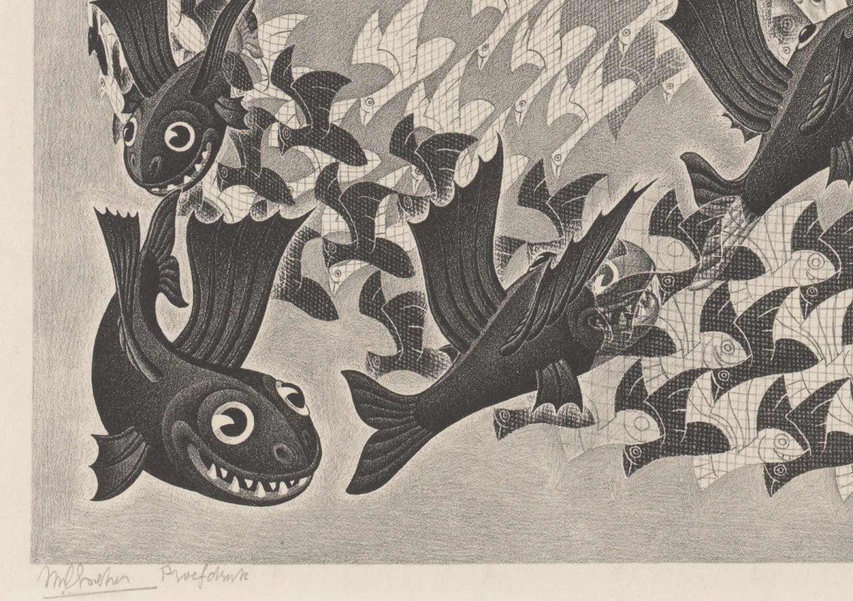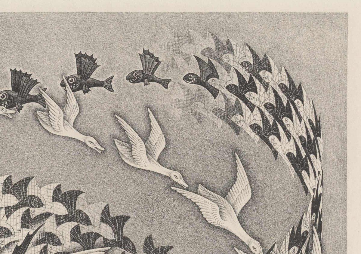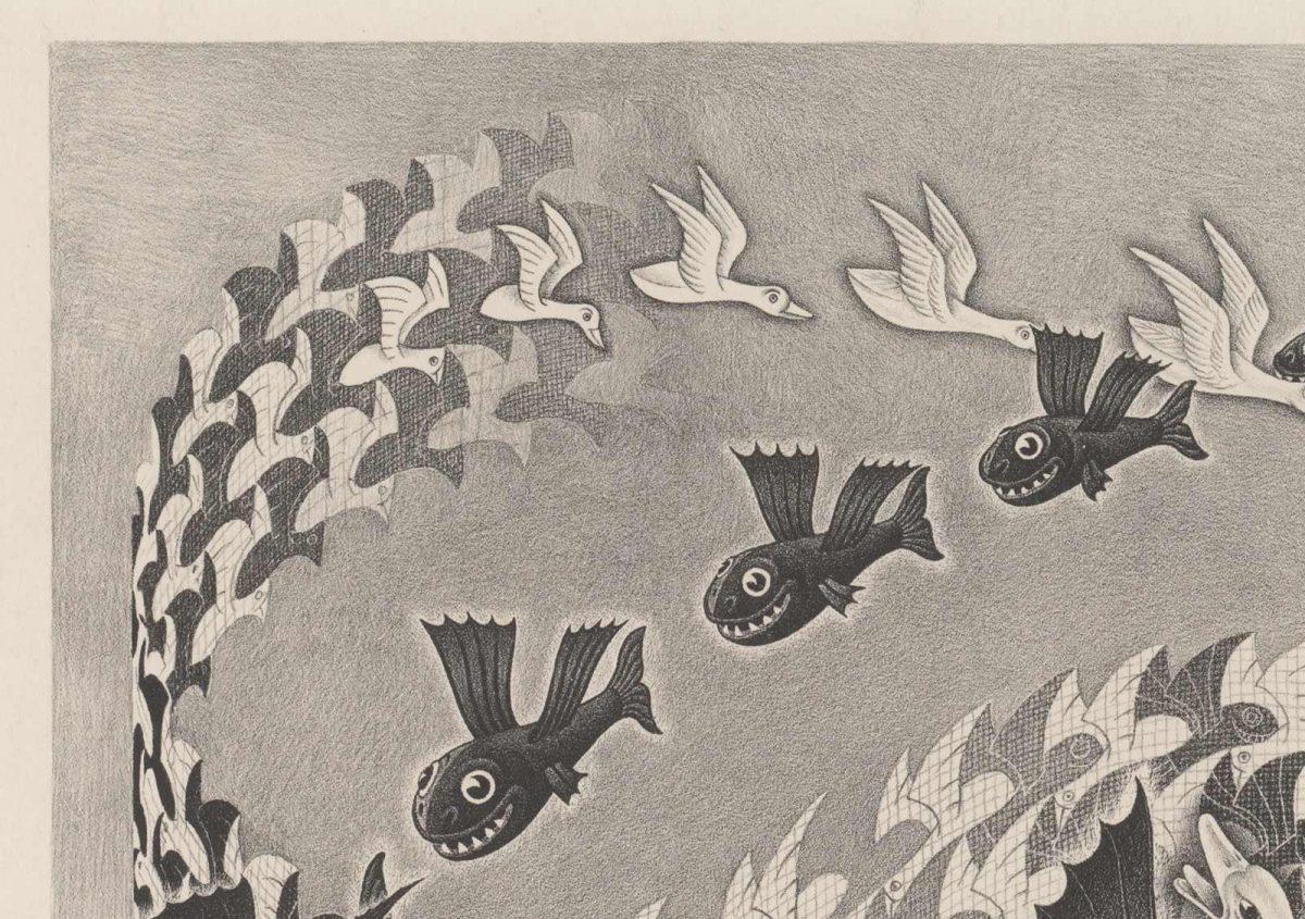 Het tot leven laten komen van figuren in een tweedimensionale vlakvulling tot driedimensionale loslopende, vliegende en zwemmende beestjes, is iets dat Escher vaker gedaan heeft in zijn carrière. Hij was nou eenmaal gefascineerd door de suggestieve mogelijkheden die het platte vlak biedt om het oog te misleiden. Zo deed hij dat bijvoorbeeld ook in de prenten Reptielen, Ontmoeting en Toverspiegel. Omdat de vogels en vissen elkaar in het midden treffen, doet de prent ook denken aan de Möbiusbanden die hij jaren later zou maken. En er zijn overeenkomsten met twee symbolen voor oneindigheid; de lemniscaat en de Ouroboros. Die laatste is een slang of een draak die in zijn eigen staart bijt en op die manier een eeuwige cirkel vormt. Deze symbolen zijn wel aan meer prenten van Escher te koppelen, maar door de vis die in de vogel bijt, is de ouroboros hier nog prangender aanwezig.