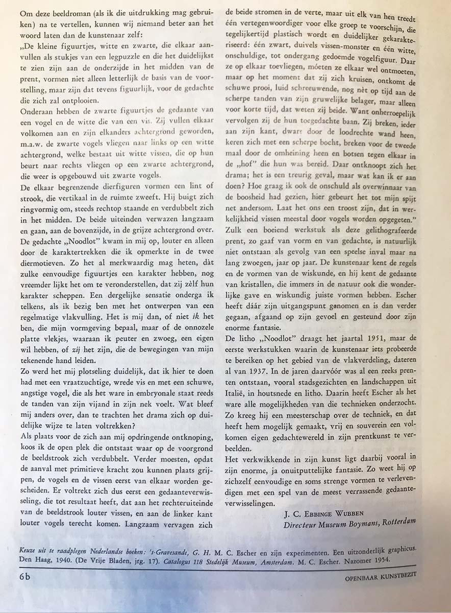 'De gedachte 'Noodlot' kwam in mij op, louter en alleen door de karaktertrekken die ik opmerkte in de twee diermotieven. Zo het al merkwaardig mag heten dat zulke eenvoudige figuurtjes een karakter hebben, nog vreemder lijkt het te veronderstellen dat zij zélf hun karakter scheppen. Een dergelijke sensatie onderga ik telkens als ik bezig ben met het ontwerpen van een regelmatige vlakvulling. Het is mij dan of niet ik het ben die mijn vormgeving bepaal, maar of de onnozele platte vlekjes, waaraan ik peuter en zwoeg, een eigen wil hebben, of zij het zijn die de beweging van mijn tekenende hand leiden.'