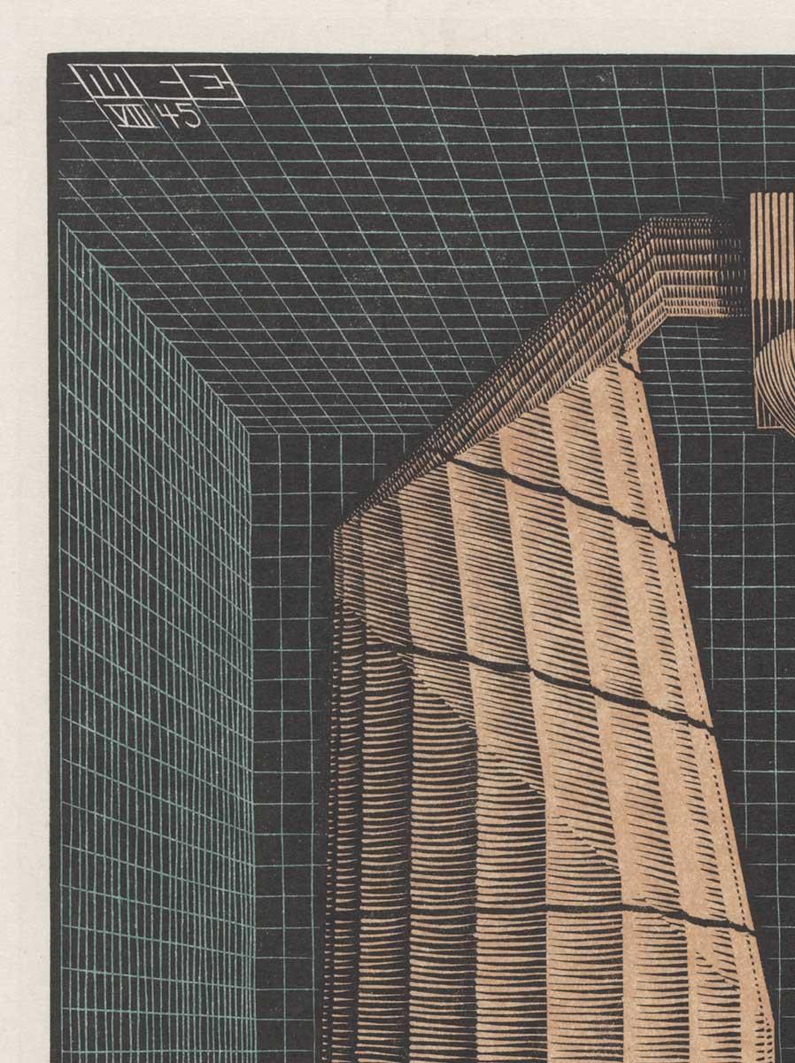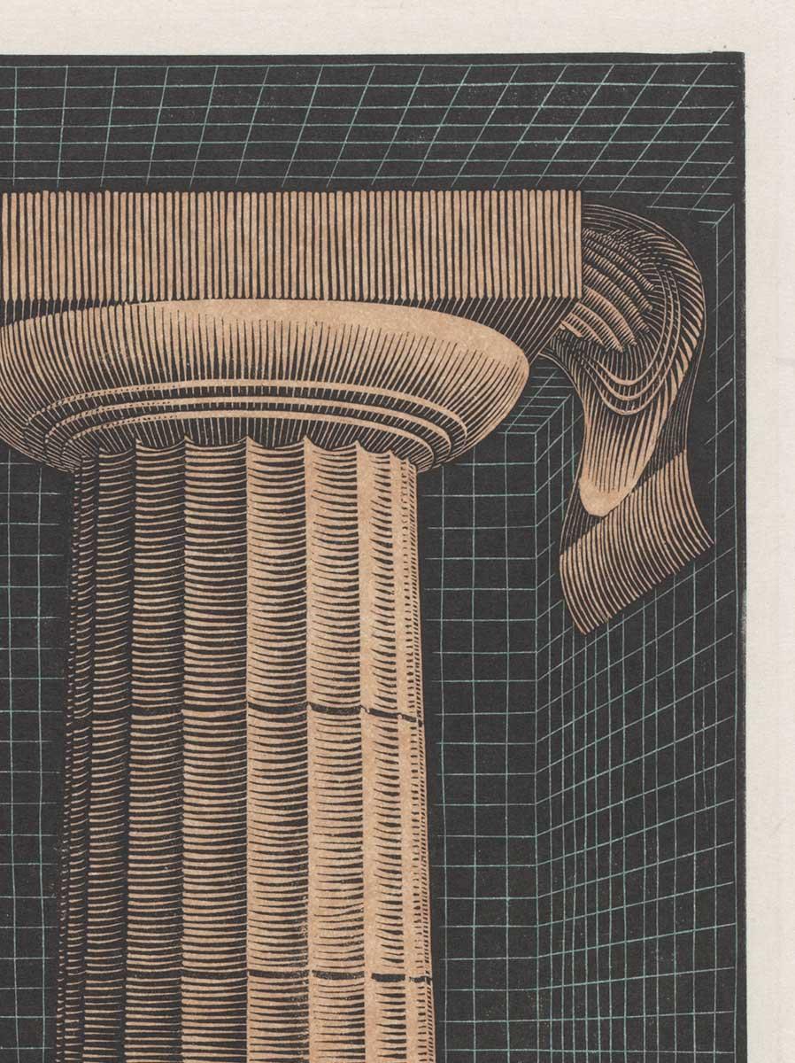 Een van de meest wonderlijke prenten van M.C. Escher is (Twee) Dorische zuilen. Een houtgravure in drie kleuren die hij maakte in augustus 1945. Vlak na de bevrijding dus. Het was na Balkon de tweede nieuwe prent die Escher fabriceerde na de euforische dagen van mei dat jaar.
