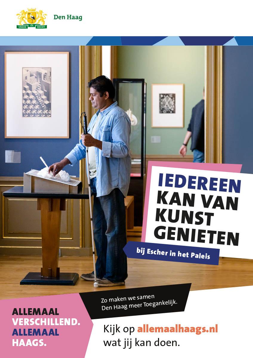 Den Haag is een stad waar iedereen ertoe doet. Kunnen meedoen moet vanzelfsprekend zijn voor bewoners met en zonder beperking. Escher in Het Paleis gelooft in die missie en we willen er alles aan doen om daarover meer bewustzijn te kweken. Daarom doen we ook vol overtuiging mee aan de campagne Allemaal Haags. Onder het motto 'goed voorbeeld doet goed volgen' zijn hierin allemaal goede Haagse initiatieven te zien voor een toegankelijkere stad. Onze inzet voor blinden en slechtzienden is een van die voorbeelden.