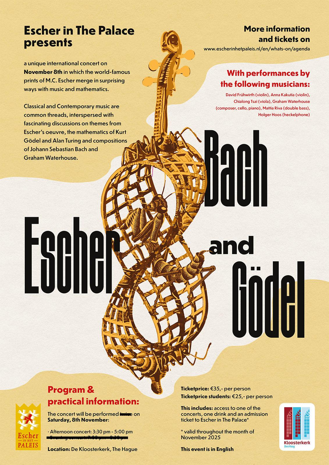 Escher in Het Paleis organiseert een uniek concert waarin de wereldberoemde prenten van M.C. Escher op verrassende wijze samenvloeien met muziek en wiskunde. Klassieke muziek vormt de rode draad, afgewisseld door boeiende gesprekken over thema’s uit Eschers oeuvre, de wiskunde van Kurt Gödel en Alan Turing, en de composities van Johan Sebastiaan Bach.