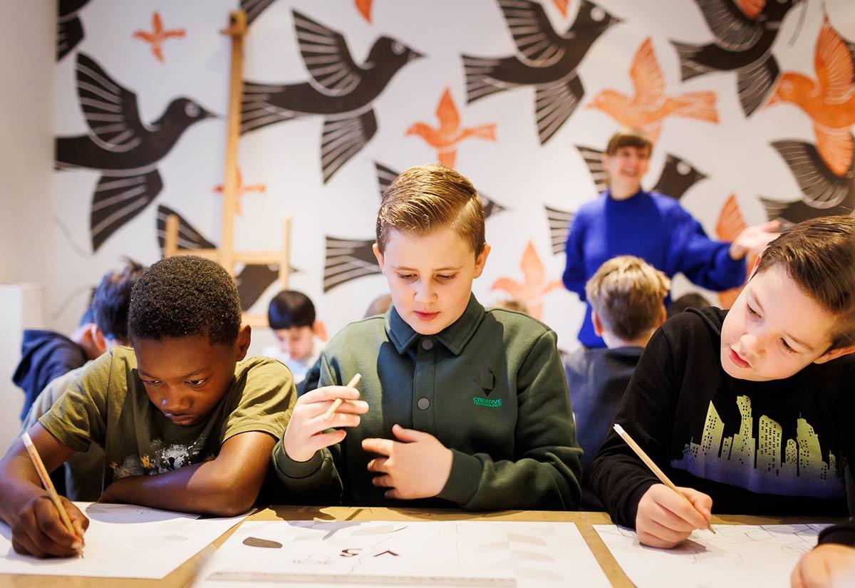 Tijdens dit schooljaar zijn maar liefst 700 Haagse basisschoolleerlingen, tijdens de museumles Hoera! Escher is jarig, langs geweest bij Escher in Het Paleis om de werken van M.C. Escher te bekijken. Zo maakt de nieuwste generatie Haagse inwoners kennis met Eschers optische illusies en eindeloze metamorfoses. Vervolgens hebben de leerlingen samengewerkt aan een nieuwe metamorfose en zich door M.C. Escher en elkaar laten inspireren. In dit proces zijn ze de verbinding met elkaar aan gegaan en met elkaars verbeelde werelden. De daaruit ontstane Megamorfose is een cadeau aan Escher en aan de stad!
