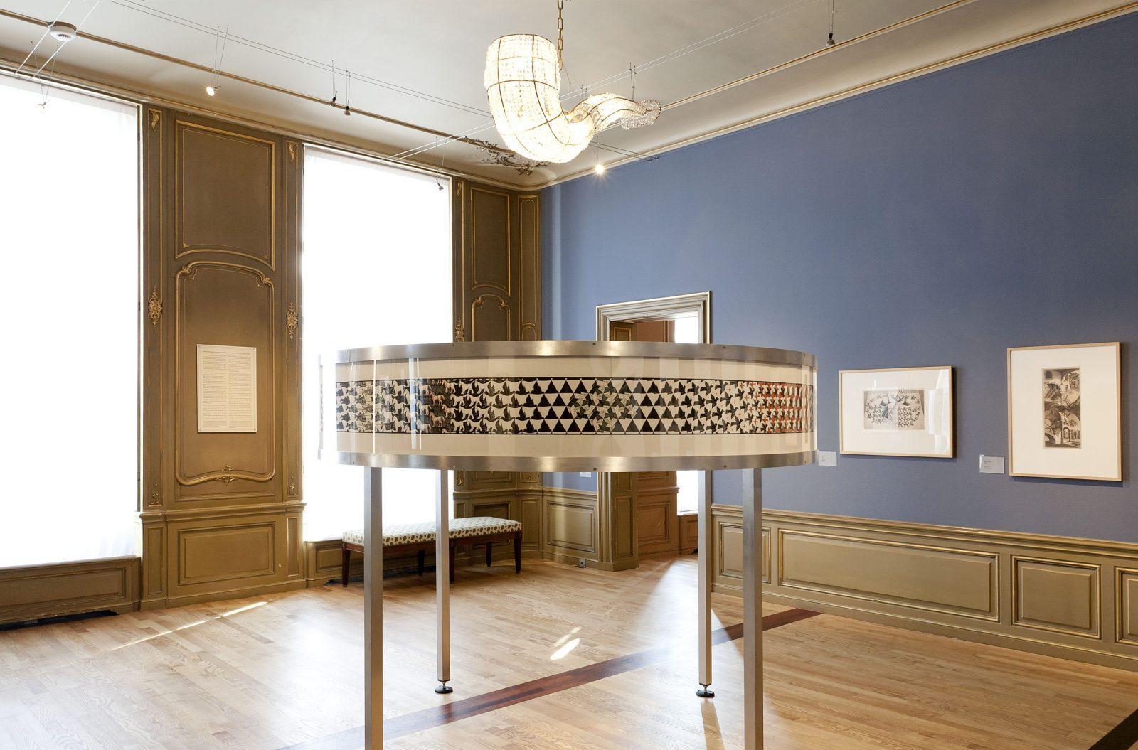 Dat is een lastige keuze, want er zijn zoveel mooie prenten van Escher, maar mijn favoriete kunstwerk is op dit moment Metamorphose III (1967-1968). Hierin zie je prachtige, speelse transformaties en komen de thema’s eeuwigheid en oneindigheid samen. Thema’s die Escher zijn hele leven al fascineerde. Het is een langwerpige prent van wel 7 meter. Vlakvullingen in 2D worden 3D en geometrische vormen komen tot leven in vogels, paarden en vissen. De manier waarop het in het museum is tentoongesteld, vind ik ook heel bijzonder. Je kunt eromheen blijven lopen.