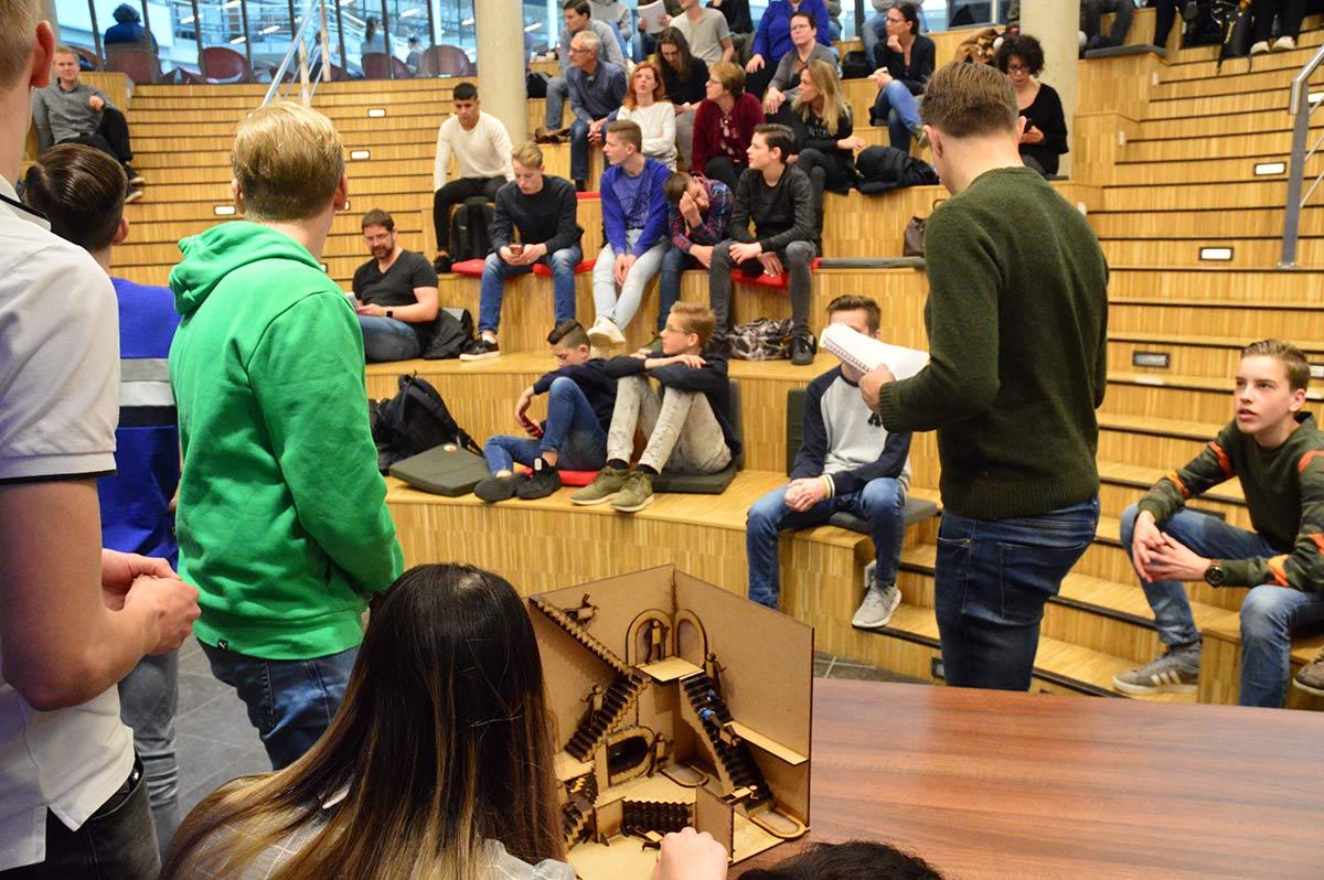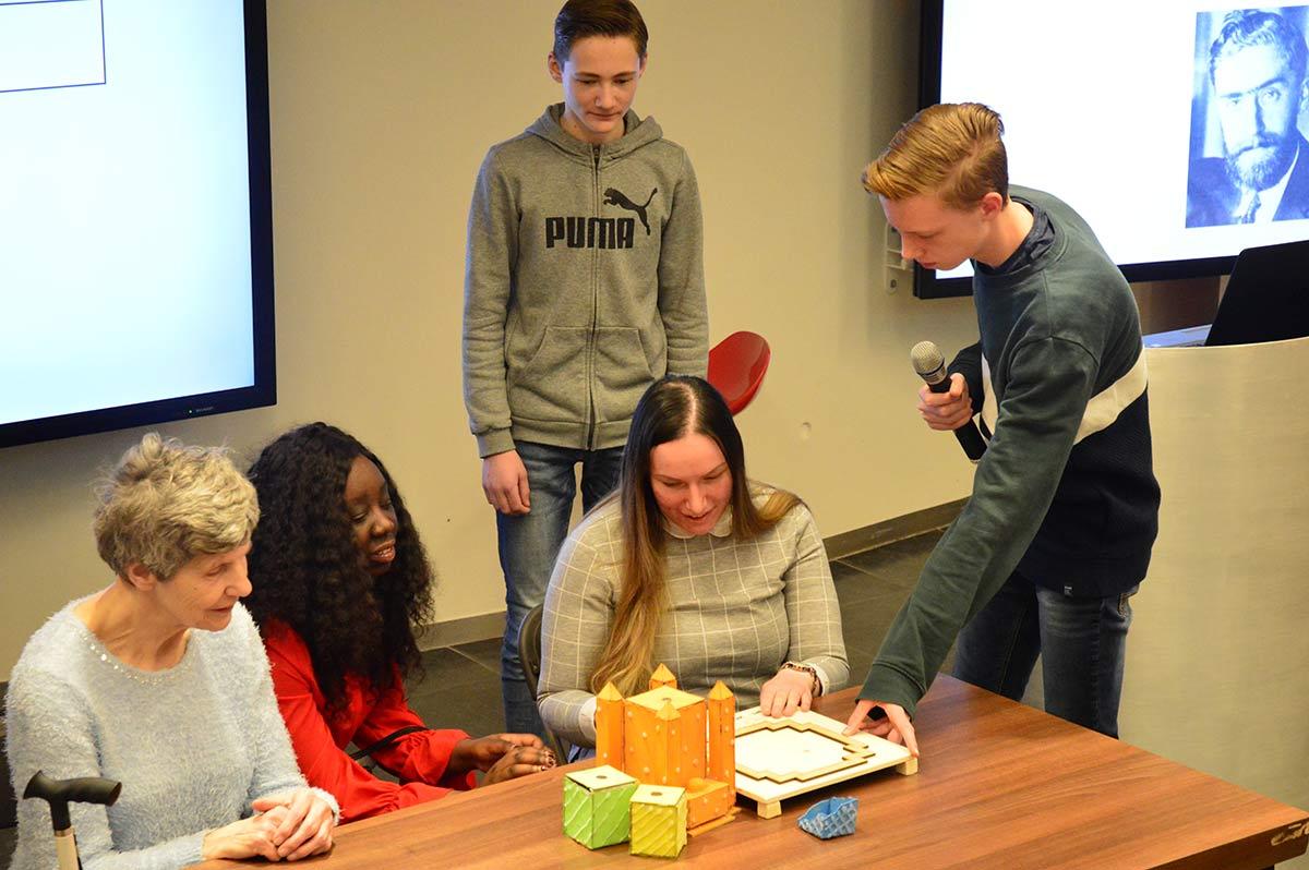 2018 was een bijzonder jaar voor M.C. Escher en voor museum Escher in Het Paleis. Afgelopen jaar is er namelijk een uniek samenwerkingsproject tot stand gebracht tussen de Haagse Hogeschool, de middelbare school ISW Hoogeland, Koninklijke Visio, stichting Voorall en het museum. De Technasium leerlingen van ISW Hoogeland onderzochten hoe de werken van Escher toegankelijk gemaakt kunnen worden voor mensen met een visuele of licht verstandelijke beperking. Een prachtige kans om ervaring op te doen met een doelgroep die zich maar al te vaak buiten hun belevingswereld bevindt. Ze zijn met hen in gesprek gegaan om te komen tot nieuwe ideeën en oplossingen zodat iedereen kan genieten van het bijzondere werk van deze beroemde graficus. Visio en Voorall ondersteunden ze daarbij. De studenten Bestuurskunde van de Haagse Hogeschool hadden de opdracht om te zorgen dat goede ideeën ook daadwerkelijk gerealiseerd worden. Uiteindelijk is gekozen om alleen de plannen voor de mensen met een visuele beperking ook daadwerkelijk in een subsidieaanvraag op te nemen bij de Gemeente Den Haag. Een geslaagde aanvraag, zo bleek. De subsidie werd toegekend en daarmee zijn een aantal unieke stukken geproduceerd die gebruikt worden om niet alleen werk van M.C. Escher voelbaar te maken, maar juist ook om het verhaal achter de kunstenaar en zijn technieken beleefbaar te maken voor mensen die blind of visueel beperkt zijn.