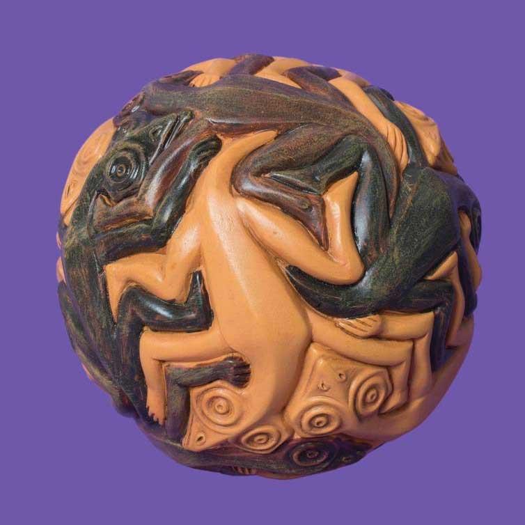 De bol is 14 centimeter in doorsnee. Het rijke oeuvre van graficus M.C. Escher kent er maar drie: een met vissen, een met menselijke figuurtjes en een met hagedissen (zie foto). Het is een schitterend voorwerp, maar bepaald niet bedoeld als een soort stressbal.
