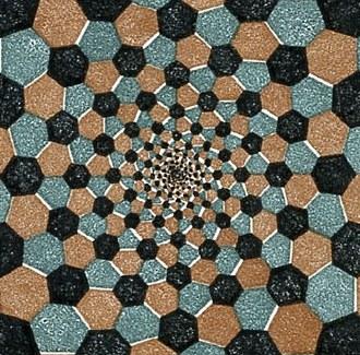Hij legt, zo lijkt het, aan de randen als het ware een net van witte gekruiste lijntjes over de vierkanten. In de tekening die hij op het houtblok maakt, besluit hij welk vlak zwart wordt en welk vlak wit. In een zwart vlak maakt hij dunne ruitjes, voor een wit vlak maakt hij dikke ruitjes. De dikke lijnen worden weggestoken en blijven wit. Als hij de dunne lijntjes maakt, is er meer zwart over en lijkt dat vlak dus zwarter. Samen neemt ons oog dit waar als grijs. Omdat de vlakken als een schaakbord om en om in twee rijen liggen, versterkt dit patroon de illusie van het grijs.