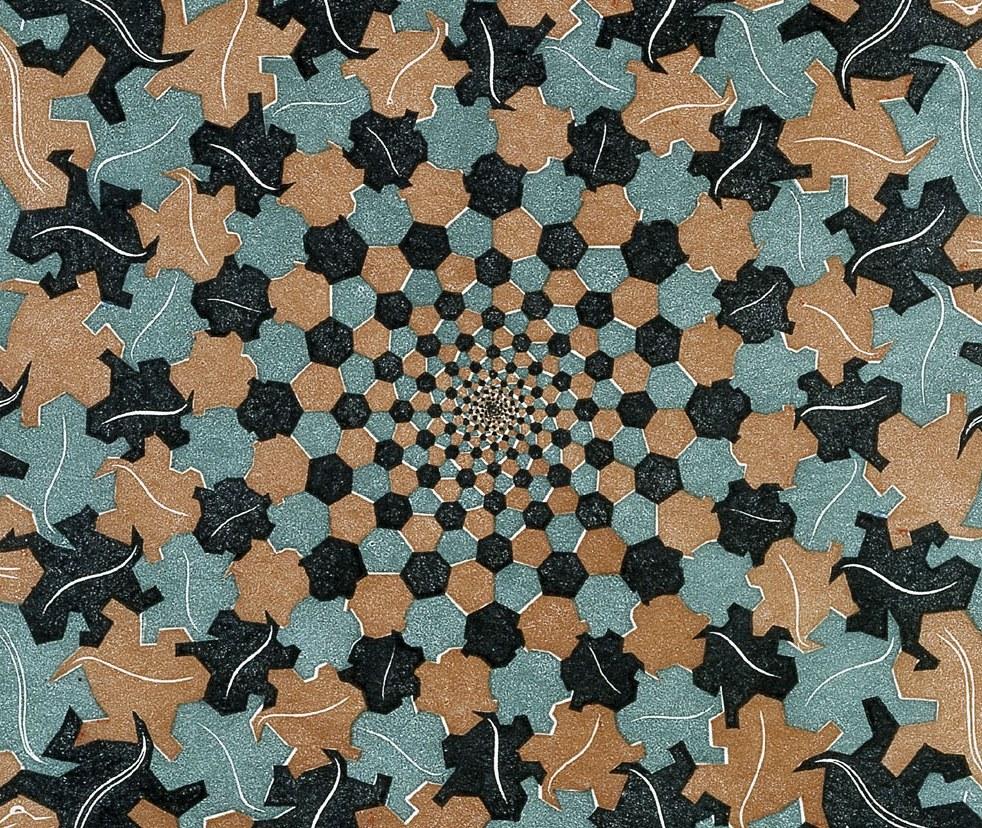 Escher komt niet alleen dankzij Pólya tot deze overgang naar een beweging. In de literatuur die hij in november 1937 van zijn oudere halfbroer Berend (Beer) krijgt, zitten ook artikelen van de Duitse wetenschapper Haag.** Hierin vindt hij veel complexere vormen dan de systemen die door Pólya worden beschreven. Door deze nieuwe kennis kan Escher zijn "realistische" figuren in beweging laten komen en ze een draai laten maken. Hij legt het draaipunt in het midden van de prent, centraal tussen de vier pootjes van een wit en een zwart reptiel.