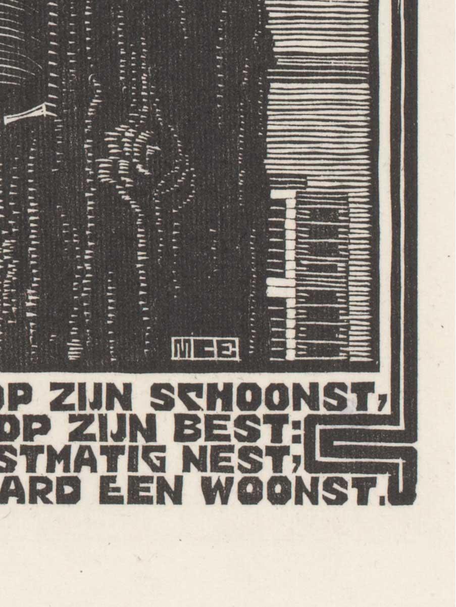 Een van die prenten is Schuilnest. Daarop staat een vogelhuisje, hangend aan een boom. Een onschuldig beeld dat door de titel al een andere lading krijgt. Maar door het bijbehorende motto en het gedicht wordt dat effect nog sterker. Hoewel Escher niet bepaald fan was van het zoeken naar betekenis in zijn werk, nodigen de Emblemata juist door die teksten daartoe bij uitstek uit.