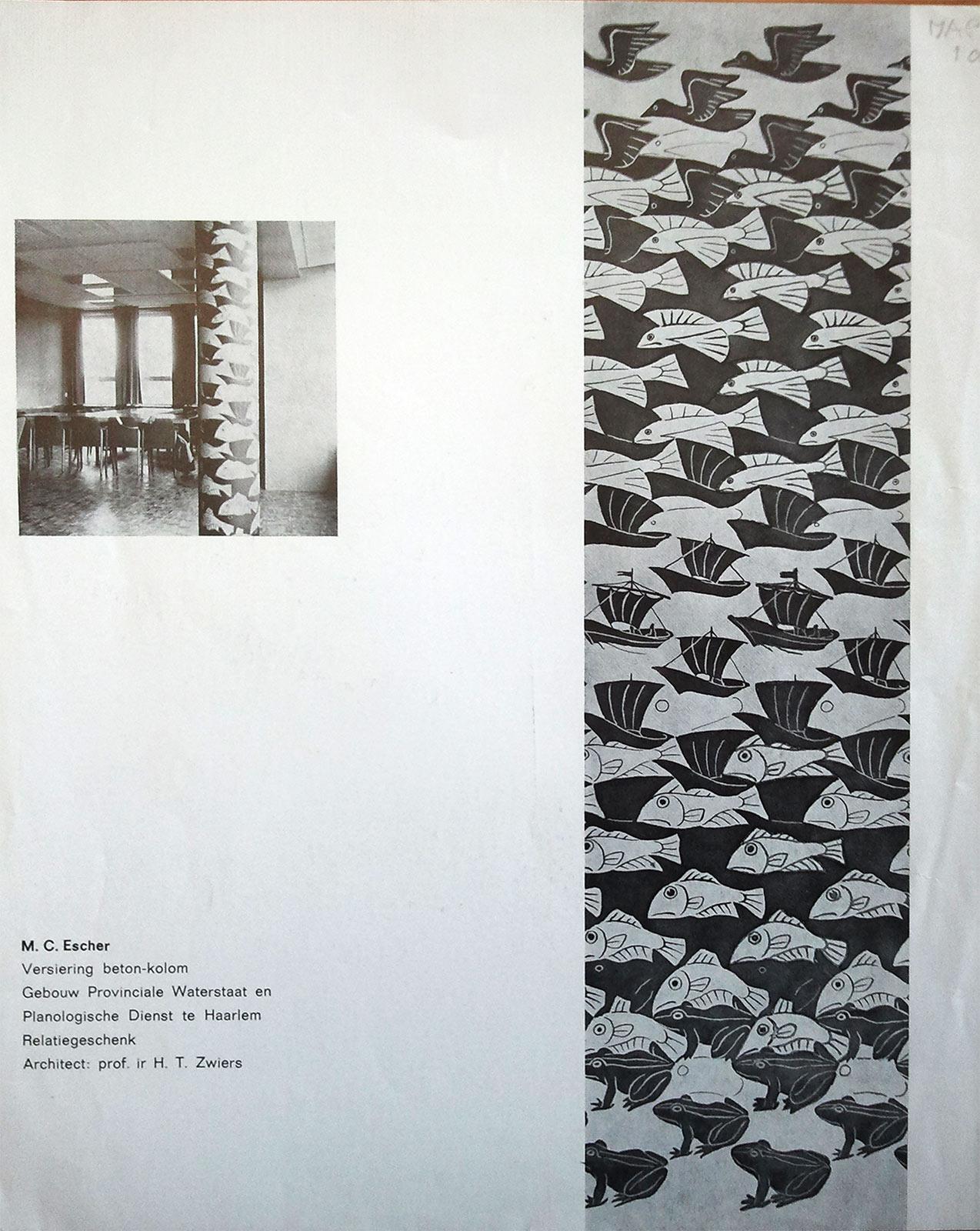 In januari 1962 maakte hij vier tekeningen, waarvan we er hier twee tonen, waarvan hij al direct wist waar hij ze voor wilde gebruiken. Escher had namelijk een opdracht gekregen van de Verenigde Noord-Hollandse Waterschappen die een cadeau aan wilden bieden aan de Provinciale Waterstaat Noord-Holland. Ze vroegen hem om een ontwerp te maken voor een betonnen zuil in het nieuwe hoofdkantoor aan de Zijlweg in Haarlem. In 1959 had hij al zuilen ontworpen voor de Johanna Westermanschool in Den Haag en dat was de overheidsinstantie waarschijnlijk opgevallen. Maar de aanpak in Haarlem verschilde wel. Voor de school werd de vlakverdeling uitgewerkt in tegels. Voor de zuil in Haarlem werd het ontwerp op het beton geschilderd. Het was een opdracht die hij zowel leuk als toch ook wat vervelend vond. In een brief aan zoon George en diens vrouw Corry schreef hij op 13 januari 1962: