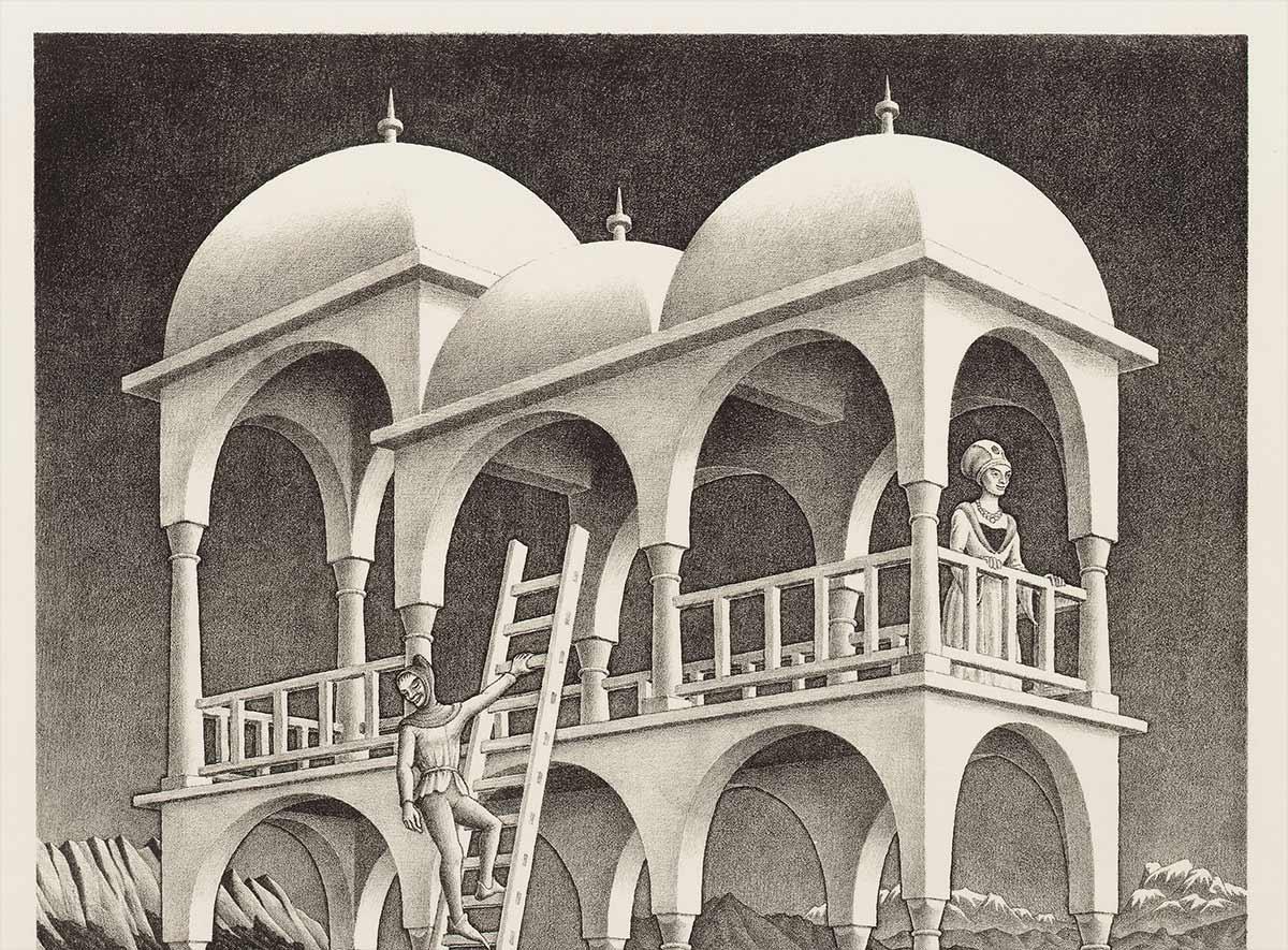 Escher’s print conflates tower and gallery. The walls that are spill over the sides of the frame on the left and right also seem to suggest that this beautiful view is an addition to an existing building. The characters’ clothing is a clear allusion to the late Middle Ages. The woman at the bottom right even has a direct link with Hell, the copy he made of the Garden of Earthly Delights by Hieronymus Bosch. The landscape at which the people are looking cannot be defined geographically. But given Escher’s love for the Italian landscape, which he immortalised countless times in the prints he produced over the 1928-1935 period, we can say with near certainty that this is an Italian palazzo. Somewhere in the Abruzzo, for example, though Sicily is another candidate.
