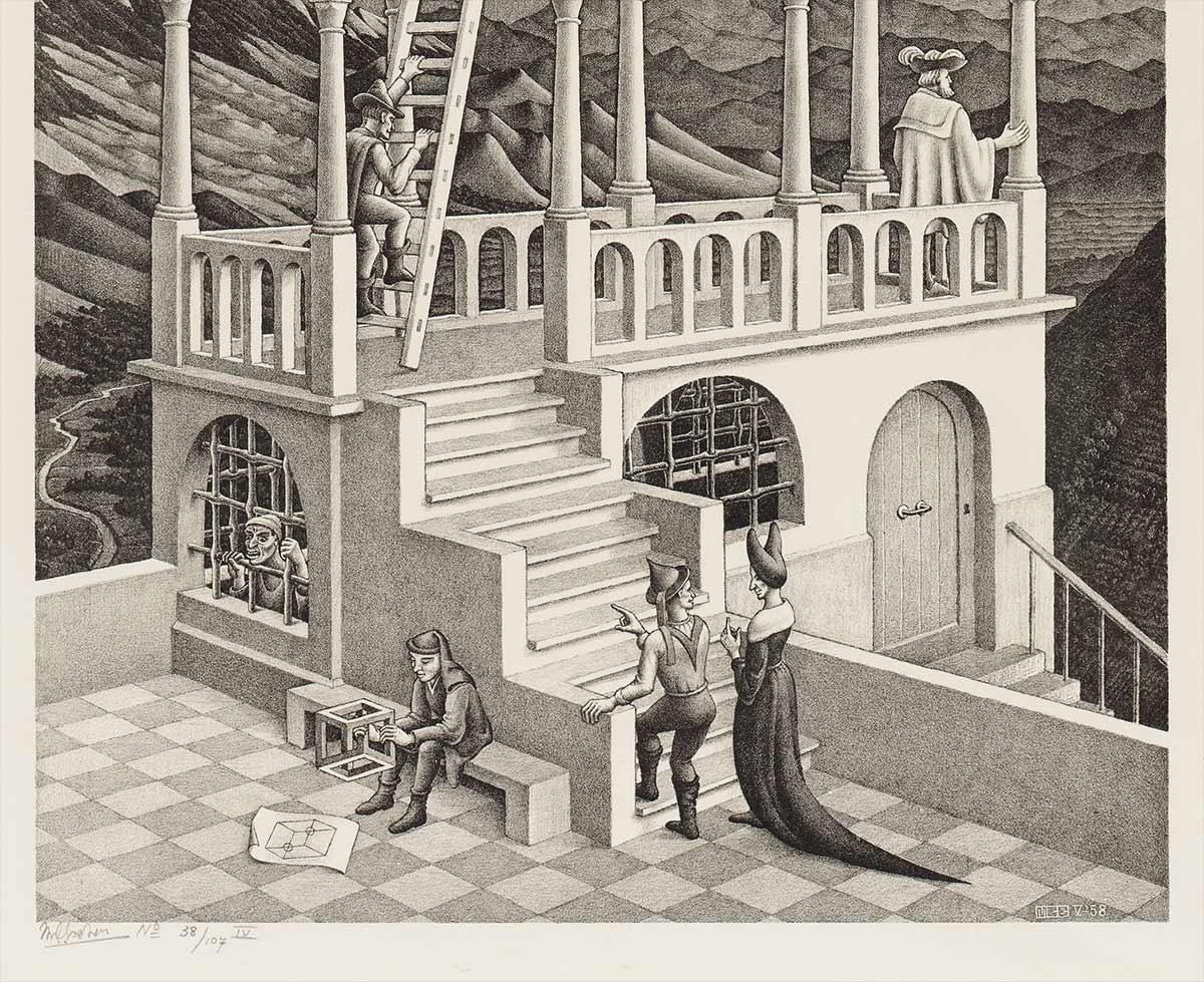To many, Escher’s impossible buildings are the highlights of his oeuvre. These are the prints that visitors look for when they come to our museum. They stand in front of them and discuss with their family and friends what they see happening before their eyes. In that respect they really are conversation pieces. If you take ‘impossible’ in a broad sense, Up and Down, House of Stairs, Relativity, Convex and Concave, Print Gallery, Belvedere, Ascending and Descending and Waterfall can be defined as impossible buildings. But it is the last three of these that Escher himself referred to as such and which are also the ones most open to interpretation. ‘Look, see that? That’s impossible, right?’