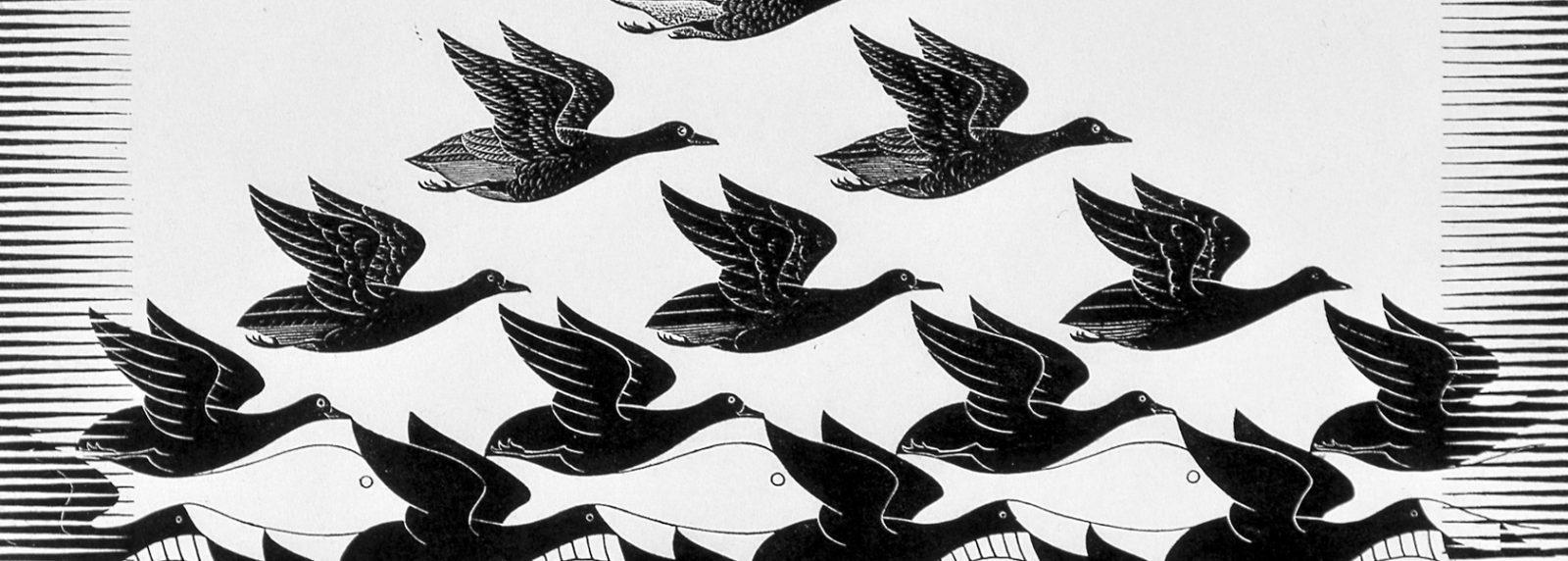 Dit werk is zo’n mooi voorbeeld van Eschers bekende uitspraak dat hij orde wil aanbrengen in de chaos die het dagelijks leven toch vaak lijkt te zijn. De eerste indruk is ook een van orde: vogels en vissen gaan allemaal in een keurige ruit naar rechts. In principe lijkt het mogelijk dat vogels vissen kunnen worden en omgekeerd. Daarover raak je verbaasd, omdat er in het midden van de prent iets wonderlijks gebeurd en zo roept Escher met zijn orde tegelijkertijd verwarring op. Zo werkt zijn manier om ons ‘te bedotten’, zoals hij het noemt. Langzaam voert hij ons in een voorstelling die mogelijk lijkt. Tot we ons bewust worden een onmogelijkheid te bekijken, waardoor we weer voor het beroemde “Escher Knippermoment” staan: weer realiseren we ons naar iets onmogelijks te kijken (vogels kunnen geen vissen worden) en toch zien we het.