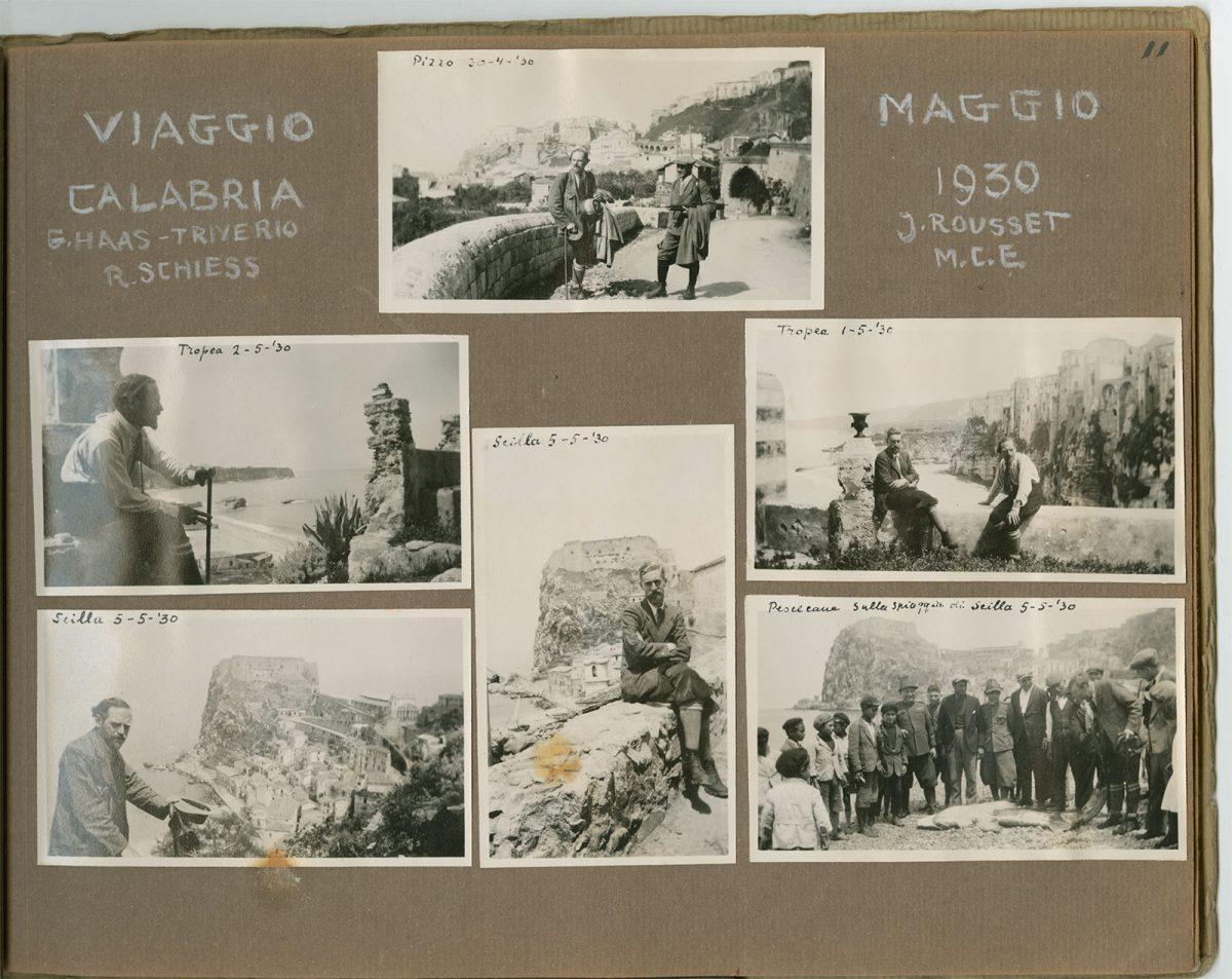 Hierboven zie je vier pagina’s van de reis naar Calabrië uit het fotoalbum van Escher. De foto’s dateren van 30 april 1930 tot 24 mei 1930. Van de 27 foto’s die Escher schoot van deze reis zijn er 10 foto’s waarop dezelfde landschappen zijn te zien als in zijn prenten. De overige foto’s zijn gemaakt van zijn reisgezelschap of van bijzonderheden uit de regio. Wanneer je kijkt naar deze verhouding verliezen de foto’s het karakter van louter gezellige vakantiekiekjes. Een deel van de foto’s diende als referentie. Het waren onderwerpen die Escher verder uitwerkte in zijn werk.